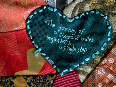 I've been reunited with a former love but my husband need not worry. The old flame I'm speaking of is hand sewing and embroidery. Ahhhhh.... so nice to be back where I started! Handmade objects, no matter how crude or refined, have always held a fascination for me, especially Victorian crafts like crazy quilts, tatted lace and embroidery. I'm sure I've mentioned to you the crazy quilt I made from men's vintage brocade ties. Well, if I haven't.... I once made a crazy quilt using men's vintage ties. The process was truly wondrous to me at the time and I felt transported by it.